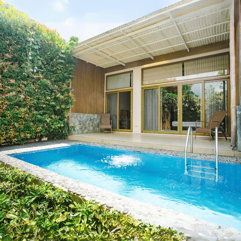 Refreshing Outdoor Pool and Private Pool: To beat the heat and unwind, guests can indulge in the refreshing outdoor pool surrounded by lush greenery. For a more exclusive experience, select accommodations come with a personal pool, allowing for relaxation in seclusion and comfort.