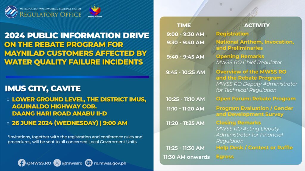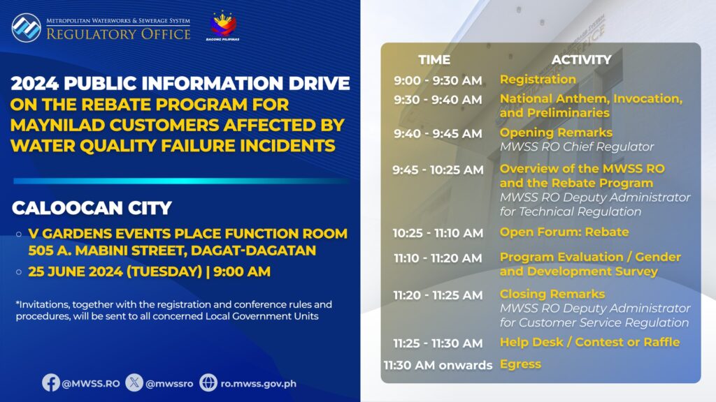 The MWSS RO has scheduled public information campaigns on its rebate program, with sessions set for June 25 in Caloocan City and June 26 in Imus City.